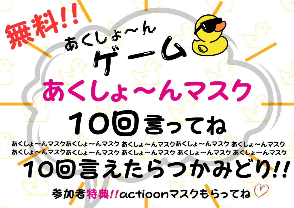 参加無料!!(参加者特典:actioonマスクもらってね)の「あくしょ~んゲーム」は大人も、こどもさんも、楽しく参加してくださり嬉しかったです☆